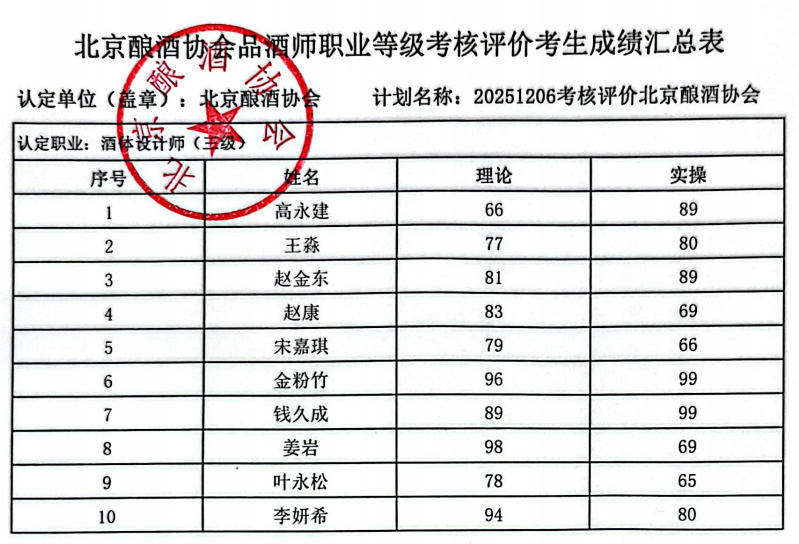 北京酿酒协会12月举办酒体设计师职业等级考核评价,考生成绩公示如下: