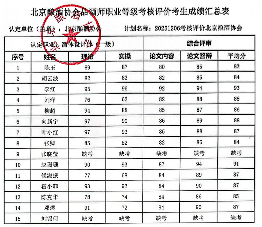 北京酿酒协会12月举办酒体设计师职业等级考核评价,考生成绩公示如下: